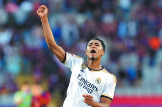 Jude Bellingham celebrates Real Madrid’s victory over Barcelona at the full-time whistle on Saturday. Bellingham netted both Madrid’s goals in a 2-1 victory for the Spanish league leader. REUTER...