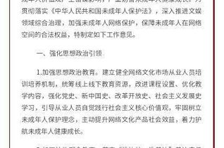 2021年12月1日 - 今日,文化和旅游部办公厅关于加强网络文化市场未成年人保护工作的意见,共18条。意见明确要求积极开展道德评议,积极发挥行业协会作用,制定网络文化市场从业人员自律管理办法,加强行业职业道德委员会建设,明确工作程序、积极开展道德评议,及时对违法失德人员及纵容违法失德行为的行业企业、从业...