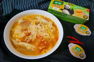- 3.一个小时后鸡汤煲好了,盛一碗出来,将泡酸萝卜捞出、切好。