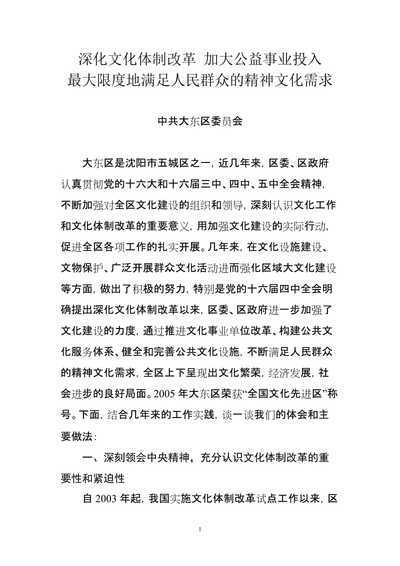 深化文化体制改革,促进文化发展文化是民族之魂,是人民的精神家园。在五千年的文化历史进程中,中华民族各民族共同创造和传承了博大精深的中国文化,伟大的中国文化在中国的各个发展阶段都发挥着重要的作用。