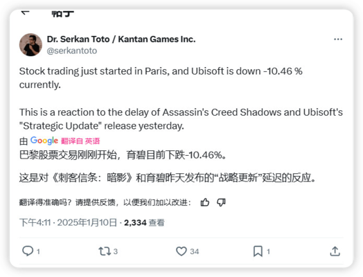 分析师Dr. Serkan Toto分析,育碧股价下跌了10....