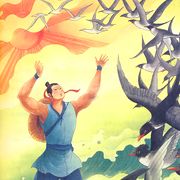 有鹦鹉飞集他山,山中禽兽皆相爱。鹦鹉自念,此山虽乐,然非吾久居之地,遂去。禽兽依依不舍。后数月,山中大火。鹦鹉遥见,心急如焚,遂入水沾沾湿羽,飞而洒之。天神言:“汝虽好意,然何足道也对曰:“虽知区区水滴不能救,然吾尝侨居是山,禽兽善待,皆为