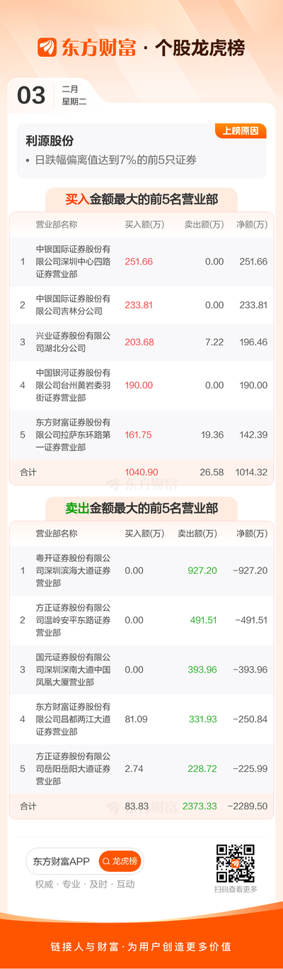 利源股份(002501)龙虎榜数据(02-03)