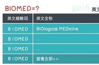 BIOMED是BIOlogical MEDicine的英文缩写,点击查看BIOMED的详细解释,还包括BIOMED的中文翻译、BIOMED的英文全称等 缩写大全