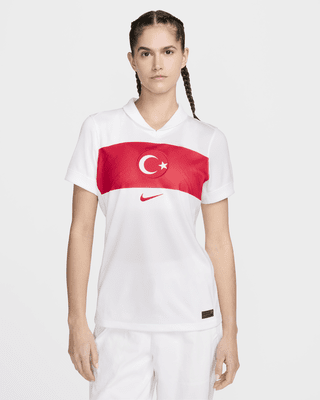 Find the Türkiye 2024/25 Stadium Home Women's Nike Dri-FIT Football Replica Shirt at Nike.co... band across the front of the Türkiye shirt has a curved top and printed crease lines to emulate the ...