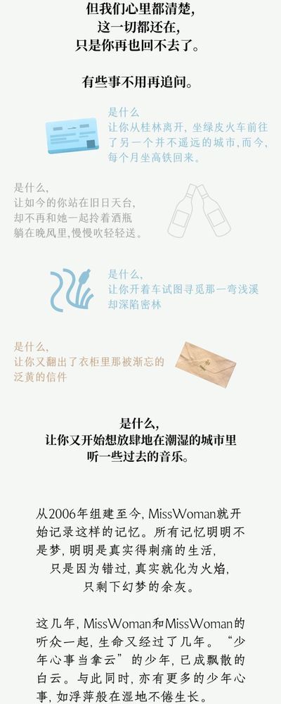 在MissWoman的作品里,我们总能隐约听见那些美丽的山水在音乐中升起,那些朴实的人们的笑脸和日复一日不变的安定的生活气息。我们总能听见MissWoman用音符轻盈灵动地抒写了百里漓江的...